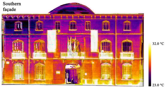 In this case, the responses to the information provided by the thermography have been disparate and related to its location. The east façade (Salvador street), which receives the sun with hardly any obstacles, has been the one that has alerted to the existence of anomalies (Figure 28), which could be architectural elements of the façade prior to the 1863 project. Also, the same study applied to the south façade has revealed anomalies (Figure 29).