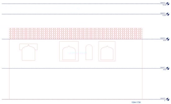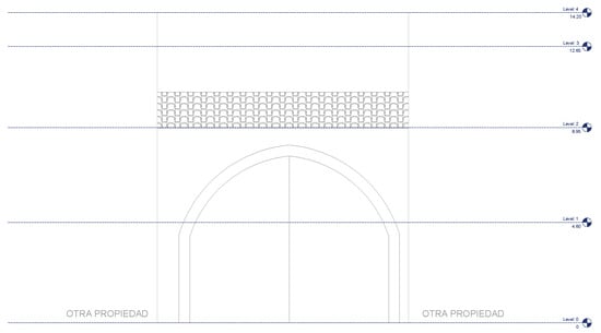 The east façade is currently longer than that of the 16th century building, which is to be determined. For this reason, the pieces added to the plan between 1738 and 1811, as well as the one added in 1863, have been subtracted. The hypothesis of the east façade, which the building would have had in 1517, is shown in Figure 31 and Figure 32. The hypothesis of the east façade, which the building would have before 1704, is shown in Figure 33. The hypothesis of the south façade, which the building would have before 1704, is shown in Figure 34. Finally, the 3D hypothesis of the building’s façades, east and south, between 1517 and before 1704, is shown in Figure 35.