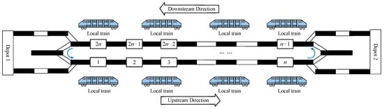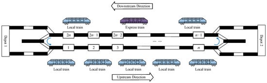 In addition, the express/local train operation strategy (ELS) is also a common approach to solving the problem of station congestion [12,13]. The ELS can speed up the cycle running time by adjusting the skip-stop behavior of express trains, and also ensure that passengers waiting on the platform can board the trains smoothly using the all-stop behavior of local trains. Due to urban development, passenger flow in commercial center stations far exceeds that of other stations. The short-turning strategy is adopted to increase the number of trains running in the commercial center section [6,14,15]. The above studies are about the imbalance of passenger flow at stations, and it is worth noting that passenger flow imbalances in opposing directions are often caused by the tidal passenger flow phenomenon [16]. However, studies on passenger flow imbalances in opposite directions are minimal.