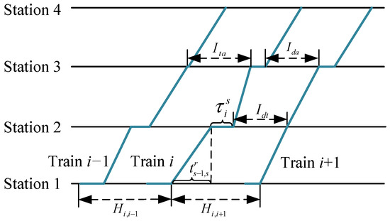 The departure time of train i at station s is related to the arrival time and dwell time , where the arrival time is composed of the departure time at the previous station s-1 and the running time from station s-1 to station s of train i, as shown in Figure 4.
