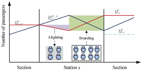 By the description of the number of passengers alighting in Equation (19), it is obvious that the number of passengers successfully boarding train i from station s with destination station k () must be obtained. Based on assumption 3, all passengers were mixed on the platform to wait for the train i, which is consistent with the actual situation. To simplify the calculations, the number of passengers who successfully board the train i is proportional to the valid number of passengers waiting.