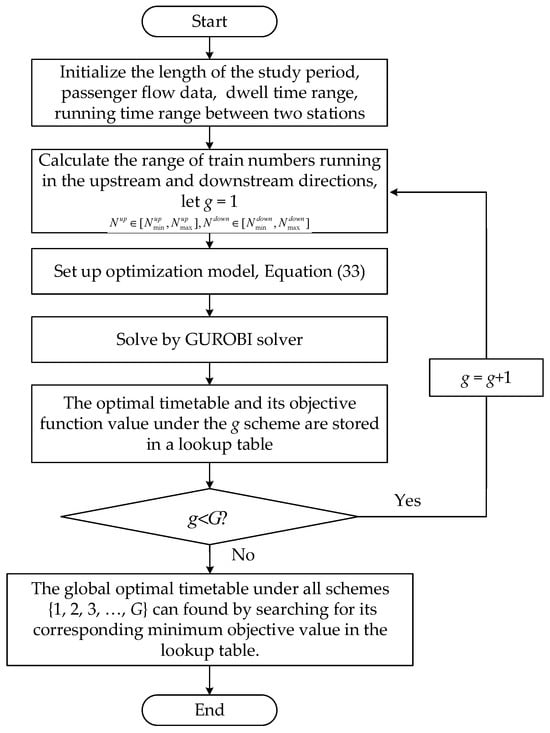 In Figure 6, the steps of the optimization procedure are described. First, the ranges of the decision variables and the passenger flow data are specified. Second, the number of trains running in the upstream and downstream directions is calculated according to Equations (2) and (3). All of the possible combinations of the number of bi-directional trains are enumerated and indexed by g = {1, 2, 3, …, G}, with G representing the total number of combinations. The corresponding train numbers for each combination g are used as inputs to the optimization model during the optimization process. The optimization model refers to a mathematical representation used to solve an optimization problem and find the best solution based on specific objectives and constraints, i.e., Equation (33), which can be solved using the GUROBI solver of MATLAB. The optimization model is set up through YALMIP/MATLAB programming. Then, the timetable and objective function value obtained under the g scheme are stored in the form of a lookup table. Finally, based on the objective function values and timetables calculated for all schemes {1, 2, 3, …, G}, the global optimal timetable can be determined by searching the lookup table.