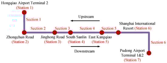 In this section, a simulation analysis is conducted based on the given passenger flow data and actual line data. In this paper, a Shanghai Suburban Railway airport link line, containing seven stations and six sections, was selected as the research object, as shown in Figure 7. It mainly involves Hongqiao Airport Terminal 2, Zhongchun Road, Jinghong Road, South Sanlin, East Kangqiao, Shanghai International Resort, and the Pudong Airport Terminal 1 and 2 stations. Since Pudong Airport Terminal 1 and 2 is a suburban station and Hongqiao Airport Terminal 2 is an urban station, the number of passengers traveling in the upstream direction far exceeds that in the downstream direction during the morning peak period [8:00, 9:00].