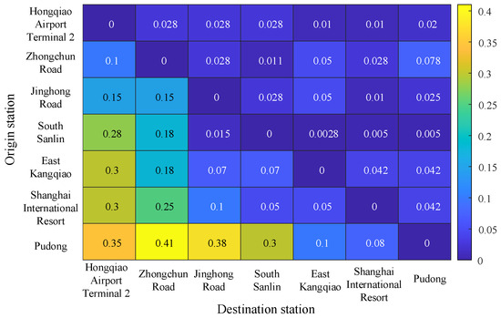After the start of official operation of the Shanghai Suburban Railway airport link line, there is likely to be an increase in passenger demand. To further illustrate the generality of the proposed solution and model, this section examines the timetable optimization to address varying passenger demand. Based on the OD passenger arrival rate shown in Figure 9, when is doubled, such as to and , it is possible to study the timetable of TUOS-ELS during the official operation period.