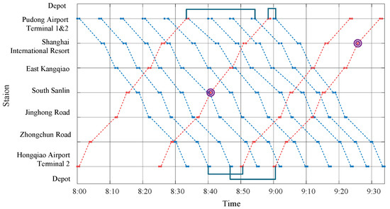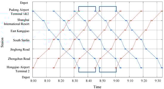 In order to solve the problem of uneven distribution of passenger numbers in opposing directions, timetable optimization based on the TUOS-ELS is studied to enhance the matching of train capacity and passenger demand. In Figure 2, the total number of trains running in both directions is eight. With the same total number of trains running, the TUOS-ELS in Figure 3 is adopted, where five trains operate closely in the upstream direction and three trains operate sparsely in the downstream direction. The flexible number of trains and the headway between two consecutive trains can accommodate uneven passenger demand. In addition, the determination of the number of trains plays an important role. The ELS is executed in the downstream direction, and the express trains can shorten the travel time from the first station to the terminal station. However, there are local trains running in both directions, maintaining all-stop behavior to ensure service quality. All-stop behavior means that the train stops at every station it passes through.