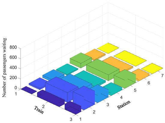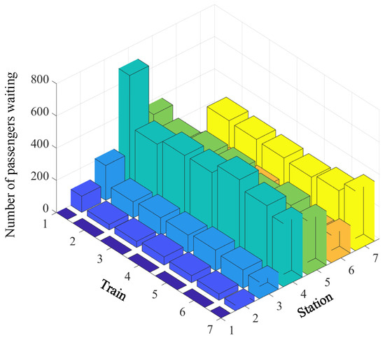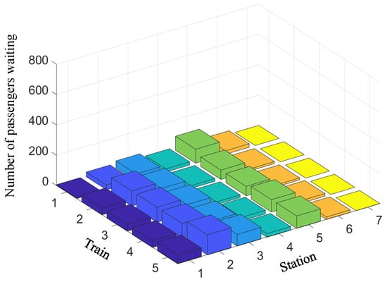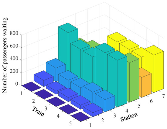 Based on the trial operation timetable of the Shanghai Suburban Railway airport link line, it is evident that the headway between trains is 15 min, and an all-stop behavior is adopted. Consequently, five trains operate in both the upstream and downstream directions. The timetable obtained by T-TPOS is shown in Figure 10. The number of passengers waiting on the stations is shown in Figure 11 and Figure 12. The train numbers in Figure 11 and Figure 12 are assigned based on the departure sequence of trains shown in Figure 10. For example, the train departing around 8:00 is assigned train number 1, while the train departing between 8:10 and 8:20 is assigned train number 2.
