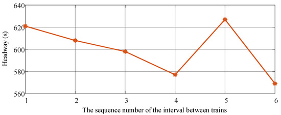 In Table 3, TUOS-ELS saves 38.59% in the total cost of the operator and the passenger compared to T-TPOS. The number of trains in the upstream direction was increased from 5 to 7, creating a shortened headway. The obtained headways for each train in the upstream direction are shown in Figure 16. All headways in the downstream direction are 1800 s. As a result, the number of stranded passengers decreased from 2489 to 196, and the total waiting time of passengers was greatly shortened from 2581.1 h to 1841.1 h in the upstream direction in Table 4. However, in the downstream, at the expense of a small number of stranded passengers, the reduction in the number of trains and the use of an express train (train 2) have significantly decreased the total travel time of trains from 10,185 s to 6139 s. Moreover, passengers’ on-board time were reduced by 8 h as compared with T-TPOS in the downstream direction.