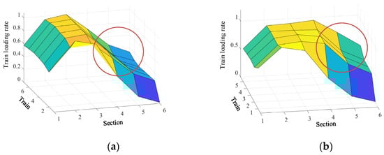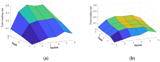 Heat maps of train loading rate under TUOS-ELS. (a) Heat maps of train loading rate in the upstream of TUOS-ELS; (b) Heat maps of train loading rate in the downstream of TUOS-ELS.