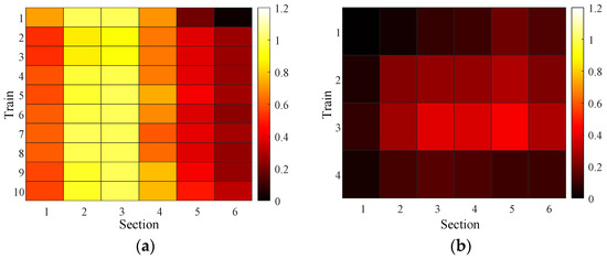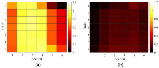To illustrate the trains’ loading rate in more detail, per-train loading rate heat maps are presented in Figure 21 and Figure 22. The total number of passengers waiting in the upstream direction for both TUOS-ELS and T-TPOS is 14,910. Meanwhile, the total number of passengers waiting in the downstream direction for both is 2280. From these two figures, it can be clearly seen that the brighter and yellower the color is, the higher the train loading rate is. The rate is close to 1.2, i.e., 120%. This reflects more crowding of passengers inside the carriages. Figure 21a and Figure 22a show the trains’ loading rates in the upstream direction for both TUOS-ELS and T-TPOS; the average loading rates were 64.33% and 75.54%, respectively. In the upstream direction, as the number of trains increased and headways shortened under TUOS-ELS, the loading rate notably declined, beginning with train 2 in Section 4, Section 5 and Section 6. The degree of passenger crowding was effectively alleviated. Figure 21b and Figure 22b indicate that trains operating in the downstream direction suffered from the problem of loading fewer passengers; their average loading rates were 18.54% and 12.03%, respectively. In the TUOS-ELS, loading rates of between 30% and 50% are achieved by train 2 and train 3 in Section 2, Section 3, Section 4, Section 5 and Section 6. The loading rate of all trains in all sections is less than 20% under T-TPOS, which is a strong indication that TUOS-ELS is effective in improving the trains’ loading rates and increasing the use of train resources.