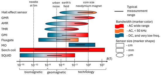 Comparison of magnetic sensors based on sensitivity, bandwidth, and size [41]. GMR—giant magnetoresistance; AMR—anisotropic magnetoresistance; TMR—tunnel magnetoresistance; GMI—giant magnetoimpedance; MO—magneto-optical; SQUID—superconducting quantum interference device.