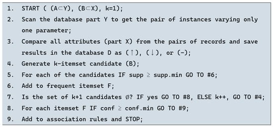 - Agrawal, R.; Mannila, H.; Srikant, R.; Toivonen, H.; Verkamo, A.I. Fast discovery of association rules. In Advances in Knowledge Discovery and Data Mining; Fayyad, U.M., Piatetsky-Shapiro, G., Smyth, P., Uthurusamy, R., Eds.; AAAI Press: Washington, DC, USA, 2021; pp. 307–328. [Google Scholar]