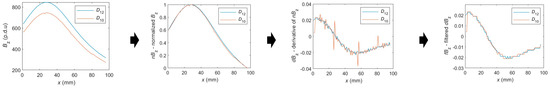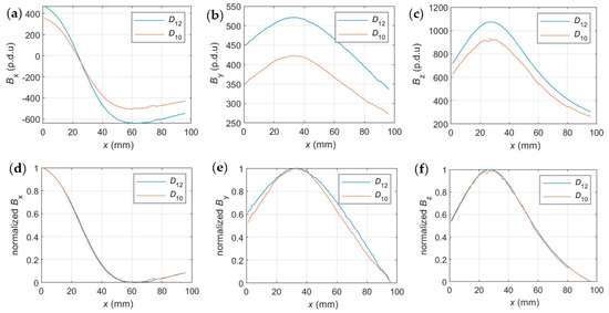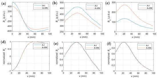 MFL—waveforms obtained for different reinforced steel classes; (a) Bx, raw data; (b) By, raw data; (c) Bz, raw data; (d) Bx, normalized data; (e) By, normalized data; (f) Bz, normalized data.