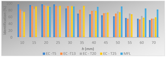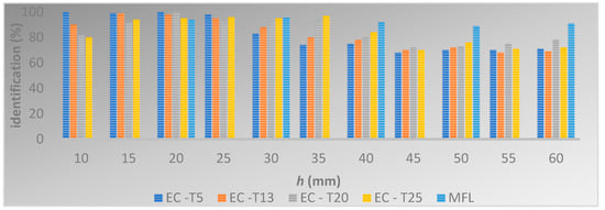 On the other hand, the EC method offers significantly better spatial resolution, making it effective for detecting small changes, such as a 2 mm diameter variation. However, it is challenging to construct an EC transducer capable of covering the entire typical range of concrete cover thicknesses within its optimal range. The MFL method offers better average identification in the whole range of measurements (depending on the EC transducer size and tested parameter, this difference can exceed 10%). However, if the EC transducer works in the optimal range (usually low concrete cover thickness), the obtained results can be significantly better than those of MFL (usually 3–10%). The EC method may be more effective than MFL when the concrete cover thickness is low, and variations in the value of the h parameter are low. Employing a set of EC transducers of varying sizes would be beneficial for achieving comprehensive identification.