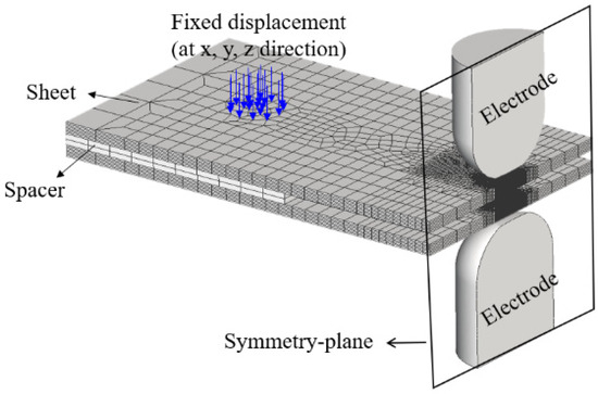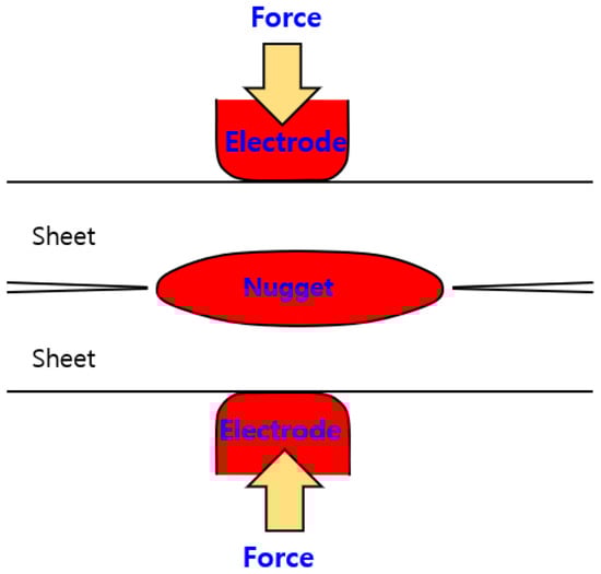 In addition, the potential for delayed fracture in spot weld joints has been explored by analyzing residual stress and hydrogen diffusion, focusing on the increased hydrogen concentration and its spread within the metal under high-temperature and high-residual-stress conditions [10]. Welding residual stress is a critical factor affecting the quality and strength of spot weld joints, motivating extensive research in this area [11,12]. For spot welding in car body manufacturing, however, gaps between sheets often arise due to spring-back effects after applying electrode pressure, as illustrated in Figure 1 [13]. These gaps can lead to deformation and misalignment during welding, thereby reducing weld integrity and productivity [14].