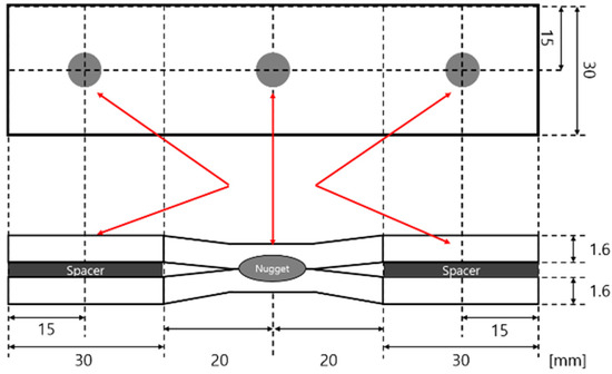 The welding conditions used for specimen preparation are detailed in Table 2. A DR-type Cu-Cr electrode with a 6 mm tip was utilized, alongside an electrode force of 3730 N, a current of 3400 A, a squeeze time of 5 cycles/50 Hz (0.10 s), a holding time of 10 cycles/50 Hz (0.20 s), and a welding time of 14 cycles/50 Hz (0.28 s). These conditions were selected to achieve a nugget size of 3. Figure 2 illustrates the specimen geometry, which had a total length of 100 mm and comprised sheets with a thickness of 1.6 mm. To simulate gaps that may occur during actual car body welding, a spacer of the same thickness (1.6 mm) was inserted between the sheets. The spacer was secured using tack welding at both ends via spot welding.