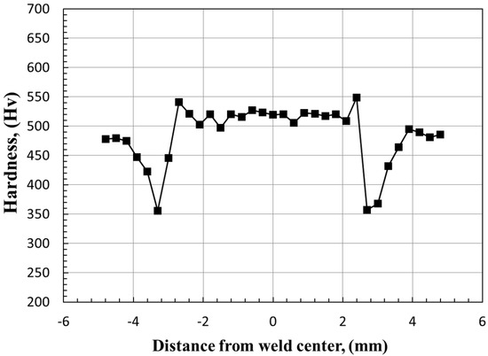 Figure 3 shows the Vickers hardness distribution of 3 (t: thickness) nugget size in SPOT welding. In this study, the hardness of the weld nugget was found to be higher than that of the parent metal, indicating superior strength in the nugget region. Conversely, the heat-affected zone (HAZ) exhibited a slight reduction in strength compared to the parent metal. Specifically, the nugget’s strength was approximately 117% of the parent metal’s strength, the HAZ adjacent to the parent metal was about 80%, and the HAZ near the nugget was around 122%. These findings suggest that the HAZ, particularly the region closer to the parent metal, may be more susceptible to failure due to its comparatively lower strength. This variation in hardness and strength across different weld regions is consistent with observations in similar studies. For instance, research on resistance spot welding of Zn–Al–Mg galvanized steel reported that the fusion zone (nugget) exhibited higher hardness due to the formation of lath martensite, while the HAZ showed varying hardness levels depending on its proximity to the nugget and base metal [20].
