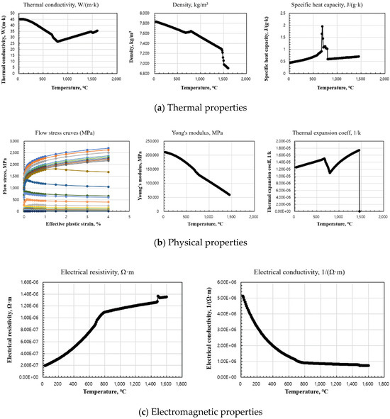 The mechanical properties required for welding analysis, including temperature-dependent physical properties, were derived using JMatPro ver. 8.0 [26], a commercial software program that predicts high-temperature material properties based on chemical composition. Figure 7 presents the input parameter values used in the analysis. Figure 7a illustrates thermal properties, including thermal conductivity, specific heat capacity, and density as functions of temperature. Figure 7b depicts mechanical properties, such as the flow stress curve, Young’s modulus, and thermal expansion coefficient relative to temperature. Figure 7c shows electromagnetic properties, including electrical resistivity and conductivity as functions of temperature. The validity of the residual stress analysis system developed in this study was confirmed through comparisons between the FEM analysis results and the experimentally measured residual stress values at corresponding positions on the specimen surface.