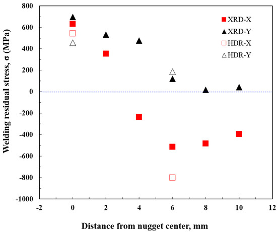 Welding residual stress distribution in nugget obtained using X-ray diffraction analysis and the hole-drilling method.