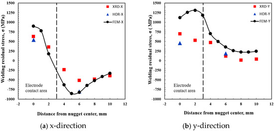 Figure 8 presents the experimentally measured residual stress distribution characteristics of the spot weld joint. The results obtained from the XRD and HDR methods indicate the distribution of residual stress with respect to the distance from the nugget center. The largest tensile residual stress was observed at the nugget center, while the tensile residual stress decreased progressively with increasing distance from the nugget center. The maximum compressive residual stress occurred at a distance of 6 mm from the nugget center. In the specimen length direction (y-direction), substantial tensile residual stress was observed up to a distance of 3 mm in the region in contact with the electrode, beyond which the stress level diminished. Similarly, in the specimen width direction (x-direction), tensile residual stress extended up to a distance of 3 mm in the region in contact with the electrode, after which significant compressive residual stress was detected. The residual stress values obtained using the XRD and HDR methods were found to be in good agreement for both directions. Due to the small nugget size (approximately 4 mm), HDR measurements were conducted only at two positions: the nugget center and a point 6 mm from the center. Although this limited the resolution of HDR measurements, the results were consistent with those obtained at 2 mm intervals using XRD. This consistency suggests that the residual stress of the spot weld joint was accurately measured by both methods.