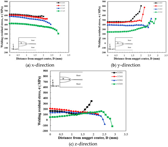 Welding residual stress distribution obtained using different nugget sizes in the (a) x-, (b) y-, and (c) z-directions using FE-analysis.
