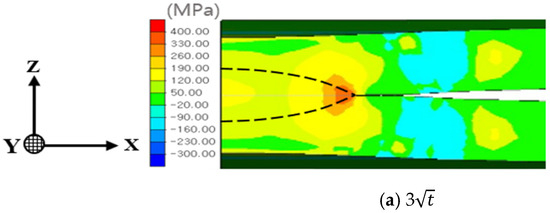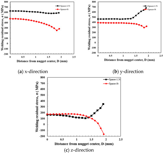 To investigate the impact of the tensile force induced by spring back on the nugget when spot welding is performed with a spacer inserted between the sheets, the residual stress distribution characteristics were examined based on the presence or absence of the spacer. The spacer used had a thickness of 1.5 mm, and a nugget size of 3 was selected for the analysis. Figure 13 presents the residual stress distribution from the nugget center to the edge in the x-, y-, and z-directions. In the presence of the spacer, the tensile residual stress at the nugget, resulting from spot welding, overlapped with the tensile stress caused by the spacer in all directions, leading to a larger distribution of tensile stress at the nugget center. In the z-direction, which plays a critical role in crack opening, compressive stress was observed at the nugget edge in the without of a spacer. Conversely, in the x- and y-directions, significant tensile residual stress was concentrated at the nugget center when a spacer was present. The stress distribution in the z-direction at the nugget center remained nearly unchanged regardless of the with or without of the spacer. However, tensile stress was observed near the electrode edge when a spacer was used, whereas compressive stress was induced at the nugget edge when no spacer was present [27,28,29]. These findings indicate that the spot weld joint with a spacer exhibits lower stability compared to the joint without a spacer [30]. This is likely due to the compressive stress induced by the electrode edge at the nugget edge. Therefore, it can be concluded that the joint with the spacer is less stable than the joint without it.
