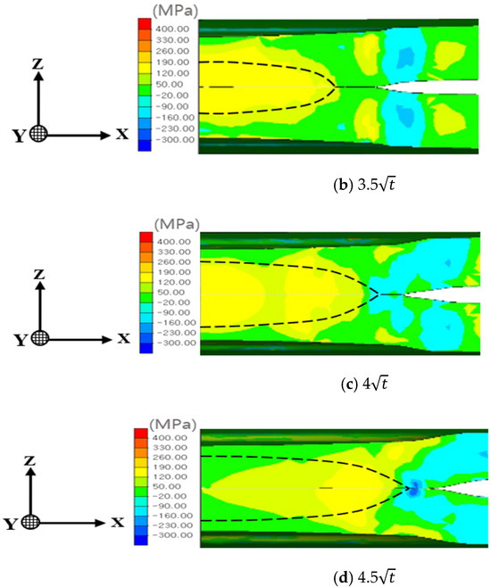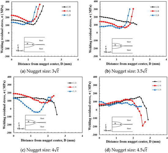 The magnitude of the residual stress distributed within the nugget varied depending on the nugget size. Additionally, the characteristics of the residual stress distribution within the nugget were examined in relation to the sheet thickness. It is believed that the stress distributed in the z-direction plays the most significant role in crack opening, and therefore, the stress distribution in this direction was specifically investigated. The sheet thicknesses selected for this study, which are commonly used in car bodies, were 1.6 mm, 1.4 mm, and 1.2 mm. Numerical analysis was performed using the same method for all three models. The results presented in Figure 12 illustrate the residual stress distribution in the z-direction (crack opening direction) from the nugget center to the nugget edge for nugget sizes of 3, 3.5, 4, and 4.5, according to the three sheet thicknesses. There was no significant difference in the maximum stress at the nugget center across the varying sheet thicknesses, but the residual stress distribution at the nugget edge exhibited some differences. Compressive residual stress was observed at the nugget edge starting from a nugget size of 4 for a sheet thickness of 1.6 mm and from a nugget size of 4.5 for 1.4 mm. For a sheet thickness of 1.2 mm, tensile stress was observed at the nugget edge for all nugget sizes. The tensile stress at the nugget edge decreased as the nugget diameter increased, with an almost uniform stress distribution throughout the nugget observed for the 4.5 nugget. As the sheet thickness decreased, the impact of spring back caused by the spacer became more pronounced compared to when the sheet thickness was higher. This is likely due to the reduction in compressive stress at the nugget edge, which is caused by the indentation of the electrode edge. When the nugget size is 3 with a sheet thickness of 1.6 mm, the joint strength is low due to the smaller nugget diameter. Consequently, despite the compressive stress at the nugget edge resulting from the electrode indentation, the tensile stress caused by the spring back effect becomes dominant, leading to a larger tensile stress distribution at the nugget edge compared to the nugget center. However, when the nugget size exceeds a certain diameter (e.g., 4 and 4.5), the increased stiffness of the nugget makes the impact of the compressive stress caused by the electrode indentation more significant than that of the spring back caused by the spacer. This results in the distribution of compressive stress at the nugget edge. The examination of the stress distribution at the nugget, considering both sheet thickness and nugget diameter, revealed that tensile stress is consistently distributed at the nugget edge for the 3 nugget size, regardless of sheet thickness. If the part is subjected to a tensile load, it will be more susceptible to fracture. On the other hand, when the nugget size increases, a higher sheet thickness proves to be beneficial in ensuring fracture resistance and safety.