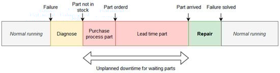 Minimizing UPDT is crucial, as cost-effective production processes are essential for maintaining business competitiveness. As shown in Figure 4, if damage occurs due to unavailable spare parts in the warehouse, significant time is required for supply and repair [7]. Therefore, finding solutions to reduce such delays is necessary.