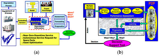 These predictive data are gathered from interconnected devices across various stages of the production process. These data aid decision-making by providing insights into the current state of all systems, facilitating effective planning for the utilization of assets in a smart factory. This concept underpins the intelligent maintenance system (IMS), which employs the Watchdog Agent™ system [15] as illustrated in Figure 6a. The Watchdog Agent™’s diagnostic and predictive capabilities can significantly enhance the system by enabling performance comparisons. This is particularly beneficial because multiple identical machines often operate simultaneously. This peer-to-peer (P2P) paradigm will enhance diagnostic and predictive performance evaluation functions through co-learning among similar machines or production lines, as illustrated in Figure 6b.