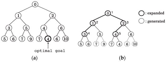- Breadth-First SearchThe breadth-first search method employs a positive cost function, notably exemplified by the A* algorithm [20]. The function h is referred to as the heuristic function, while the function f is known as the heuristic evaluation. If h does not overestimate the actual cost from node n to the target node, the heuristic estimate h consists of the following:f(n′) ≥ f(n), where n is the parent node and n′ is the child node.where k(n,n′) is the cost edge from n to n′.for h(n′) + k(n,n′) ≥ h(n)Given f(n′) ≥ f(n), or g(n′) + h(n′) ≥ g(n)Using g(n) + k(n,n′), then:g(n) + k(n,n′) + h(n′) ≥ g(n) + h(n), or k(n,n′) + h(n′) ≥ h(n)