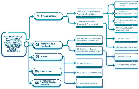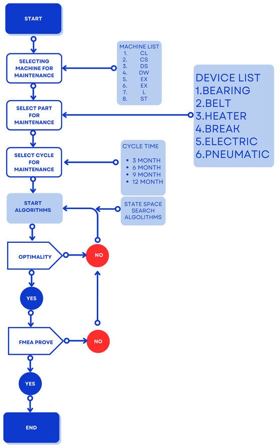 Therefore, this research proposes the implementation of the intelligent maintenance system (IMS), which integrates preventive maintenance methods with the CMMS. The primary goal of the CMMS is to optimize the maintenance process and enhance machine efficiency, thereby reducing costs and downtime in a smart factory [4]. It works in conjunction with the state space search (SSS) algorithm to present optimized solutions for equipment selection and replacement at the appropriate time, extending the lifespan of aging equipment, which is a key factor in UPDT [5]. Additionally, it recommends cost-effective maintenance strategies and considers the remaining equipment lifespan and factors in the risks associated with maintenance choices, adhering to the factory’s failure mode and effects analysis (FMEA) standards [6].
