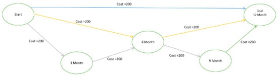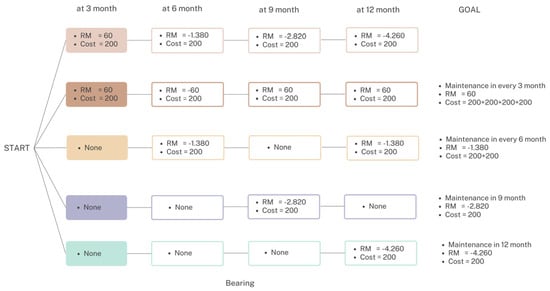 From Figure 21, the variables of interest at this time are month, cost, and RM. The algorithm must demonstrate that the minimum cost should be chosen while still ensuring the equipment has a remaining lifetime that allows for continued operation. In this study, the A* tree search method was utilized, where