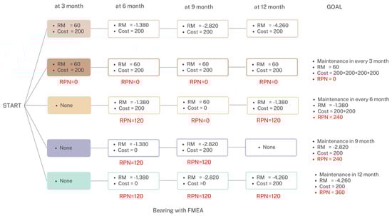From Table 9, we can see that the first maintenance method is selected at a low cost, g(x) = 200, with a remaining service life of h(x) = 60 and RPN = 0, by using A* tree search results with RPN.