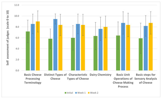 The students underwent training (>80 h) on the chemistry of dairy products, cheese manufacturing practices, cheese characteristics, and the fundamental operations involved in cheese production. They were also introduced to the terminology of sensory attributes in cheeses and the sensory analysis practices, which were used in this research. Additionally, students conducted a self-assessment at the beginning (initial) of the face-to-face program and at the end of weeks 1 and 2 (Figure 1).