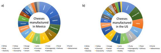 The main attributes used to describe the cheeses manufactured in Mexico and the US are shown in Figure 2, revealing distinct differences in their sensory profiles. The main attributes of cheeses manufactured in Mexico, selected by semi-trained judges, were softness, whiteness, saltiness, homogeneity, herbal notes, lactic qualities, acidity, granularity, umami, and adhesiveness (Figure 2a). Meanwhile, cheeses manufactured in the US were characterized by softness, homogeneity, yellowness, umami flavor, elasticity, acidity, firmness, lactic qualities, saltiness, and adhesiveness (Figure 2b). Differences between cheeses manufactured in the US and Mexico could be explained due to their differences in their elaboration process as described in Table 1.