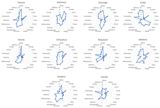 Descriptive analysis of cheeses manufactured in Mexico; 0−10: intensity level, where 0 represents absence and 10 is the highest intensity.