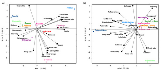 A PCA was conducted to determine which attributes best describe each type of cheese. The information of cheeses manufactured in Mexico and the US is divided into two PCAs to better appreciate the attributes that describe each cheese (Figure 5). Upon analyzing the PCAs, it is evident that cheeses manufactured in Mexico and the US stand out for their distinct sensory profiles. In addition, Figure 5 shows that the models explain more than 62%, and we can clearly observe the most representative attributes associated with each cheese. For example, Cotija cheese is linked to a putrid odor, body odor, saltiness, and chemical odor. Panela and Requeson are mainly associated with softness. Meanwhile, Ocosingo and Adobera are associated with saltiness and adhesiveness. The same explanation can be observed with cheeses manufactured in the US, where the PCA in Figure 5b can serve as a guide to establish the most important attributes that describe each cheese. For example, mild cheddar is associated with the orange color and acidity. Monterey Jack is linked to homogeneity. Additionally, sharp cheddar, smoked Gouda and Pepper Jack are associated with an orange color. Mozzarella can be associated with homogeneity and elasticity. On the other hand, the original blue cheese displays putrid odor and body odor. We can see that Parmesan cheese has different attributes that describe this product as firm with a fruity odor. According to the USDA, in 2023, Parmesan was one of the most consumed specialty Italian cheeses in the US, after Mozzarella [34].