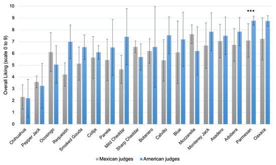 Differences of overall liking ratings for each cheese by judges from Mexico and the US, where *** refers to a significant difference (p = 0.0008).