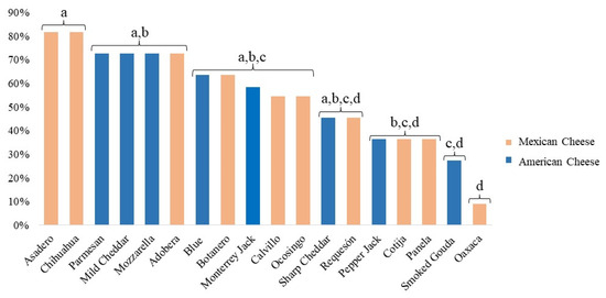 Diverse perceptions were observed concerning how participants of different nationalities perceive cheeses manufactured in the US and Mexico. Through an analysis of variance (ANOVA) for each type of cheese and each cheese parameter (Table 3), we observed significant differences (p < 0.05) in terms of aroma for cheeses such as Asadero, Chihuahua, and Oaxaca. The composition of Oaxaca and Asadero are similar, and both are pasta-filata Mexican cheeses [35]. In contrast, only one American cheese, Monterey Jack, showed significant differences (p < 0.05). On one hand, Mexican products tend to have less of a maturation process, which is why “quesos frescos” (fresh cheeses) are the most popular among all Mexican cheeses, accounting for 80% of the total cheese production in Mexico. These cheeses are commonly made from cow, sheep, and goat milk, with cow’s milk being the most prevalent. In Mexico, cheese production can be carried out using traditional, semi-mechanized, or fully mechanized methods and can involve either raw or pasteurized milk. However, the use of non-pasteurized milk is illegal and could be used in the informal cheese markets. On the other hand, the US dairy industry is highly regulated; the vast majority of cheese made in the US is made with pasteurized milk. Cheese made from raw milk is held for a 60-day ripening period at no less than 1.7 °C before sale [34]. In addition, the Code of Federal Regulations [36] established standards of identity for major cheese categories. For example, Monterey Jack cheese must made from pasteurized cow’s milk and contain not more than 44% moisture.