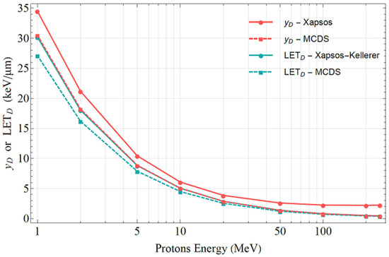 The MCDS was originally developed to estimate the clustering of DNA lesions to form SSB, DSB and other complex types of DNA damage [46,47]. Version 3.10A of the MCDS introduced the capability of calculating microdosimetric quantities (e.g., lineal energy and specific energy) for ions passing through a water (or a water-equivalent) medium via a deterministic algorithm that accounts for changes in energy loss and finite ion range within micron-scale targets [17,48]. The irradiation geometry used in the MCDS corresponds to protons (or other ions) randomly entering a spherical target surrounded by a vacuum with options to consider a spherical layer of water (e.g., cell cytoplasm) or a water-equivalent layer representing the bottom of a cell culture dish. The protons are assumed to travel in a straight line until their kinetic energy reaches zero. The algorithm accounts for both crossers and stoppers, i.e., protons that spend either part or all of their kinetic energy within the target volume, respectively, as well as for changes in proton stopping power within the target volume. However, MCDS neglects energy-loss straggling, so, for monoenergetic beams, the equality = holds. For polyenergetic beams, the MCDS computes the dose-averaged LET averaged over the incident ion fluence. The MCDS algorithm does not account for δ-rays produced by ions within or external to the target. For conditions in which particle equilibrium holds, and hold. When stoppers become significant (the range is less than the diameter of the target), which the MCDS accounts for, and .