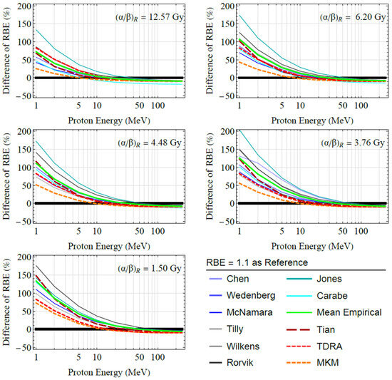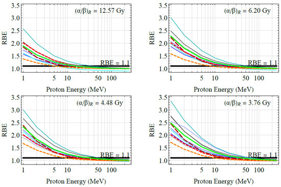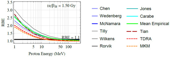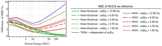 Figure 2 shows a comparison between the proton RBE models examined in this work. All models follow the same trend and predict a variable RBE that increases with decreasing proton energy. The variation in RBE is more evident for cells with a lower ratio and at proton energies below a few tens of MeV. In these cases, significant deviations from the fixed value RBE = 1.1 are noticed (see Figure 3). More specifically, for cells with high , the mean RBE of the empirical models () varies from ~1.0 (>50 MeV) to ~2.0 (<50 MeV) whereas for cells with lower it can reach values up to ~2.5. However, the variation among the individual (empirical) RBE models may be significant. For example, at high energies, the individual (empirical) models differ from the mean value () by ±10%, while at low energies the variation reaches ±30%. The results of biophysical models also support a variable RBE yielding a similar trend with the empirical models. However, biophysical models predict systematically lower RBE values from the empirical models. For example, at high energies (>50 MeV), biophysical models predict up to 10% lower values from , whereas at lower energies (<50 MeV) the differences can reach up to 30%. For cells with high , the RBE of the biophysical models varies (on average) from ~1.0 (>50 MeV) to ~1.7 (<50 MeV), whereas for cells with lower it can reach values up to ~2.0. As regards the differences among the biophysical RBE models (TDRA vs. MKM), they are up to ~5% at high energies but reach ~30% at the low-energy end. It follows from the results depicted in Figure 2 and Figure 3 that proton RBE is variable over the proton energy range studied (1–250 MeV) and may differ significantly from the fixed value of RBE = 1.1, especially at proton energies below a few tens of MeV. However, the variation among the different models at low proton energies (<50 MeV) is sizeable (~30%), precluding a firm conclusion regarding the exact RBE variation at these energies.
