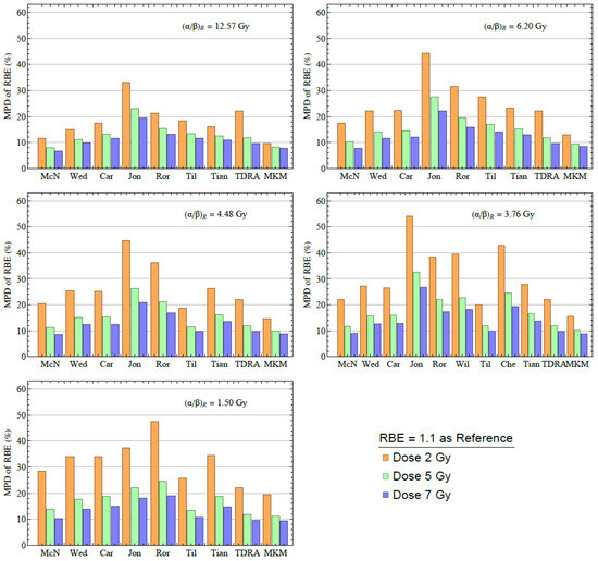 Using the data of Figure 3, in Figure 4 we show the mean percentage difference (MPD) of each RBE model against the value RBE = 1.1 calculated from: