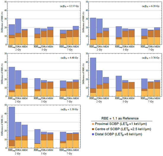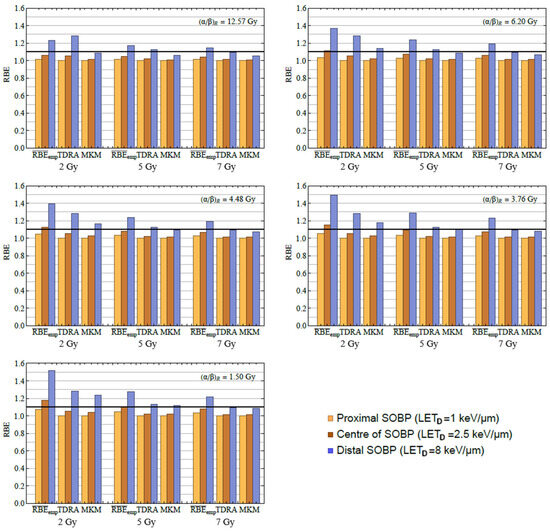 In Figure 6, we compare the average empirical RBE () against the TDRA-based RBE and the MKM-based RBE for three values which correspond (approximately) to different depths of the SOBP, namely, the proximal SOBP (~1 keV/μm), the center of SOBP (~2.5 keV/μm), and the distal SOBP (~8 keV/μm) for three different dose levels (2 Gy, 5 Gy and 7 Gy) [1]. At conventional dose fractions (~2 Gy), the two biophysical models (TDRA, MKM) predict that, at the proximal SOBP, the RBE is ~1.0 regardless of the cell type, while varies from 1.0 to 1.1 (increasing with decreasing ratio). At the center of the SOBP, both the MKM and TDRA predict that the RBE is ~1.05, while values range from 1.05 to 1.2 (again, increasing with decreasing ratio). At the distal SOBP, the RBE takes the highest values and its dependence on the cell type is more pronounced, e.g., the RBE of the biophysical models varies from 1.1 to 1.3 while the varies from 1.2 to 1.5 (in both cases, increasing with decreasing ratio). At hypofractionated dose fractions (5 Gy and 7 Gy), the RBE values at the proximal and central regions of the SOBP do not differ from the values observed for the conventional dose fraction (~2 Gy). However, at the distal SOBP, the RBE for the 5 Gy and 7 Gy dose fractions is lower compared to the RBE for a 2 Gy dose fraction, e.g., the biophysical models predict an RBE of 1.05 to 1.15 (vs. 1.1–1.3), while the ranges from 1.15 to 1.3 (vs. 1.2–1.5).