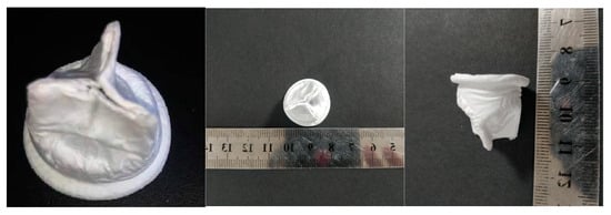 The outer diameter of the electrospun heart valve was 2.34 cm ± 0.52 mm, the inner diameter was 1.78 cm ± 0.32 mm, the height was 2.61 cm ± 0.21 mm, and the thickness of the leaflet was 0.97 ± 0.24 mm, as shown in Figure 3.