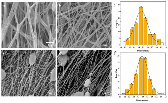 SEM images of electrospun scaffold and fiber diameter distribution. (a,b) Outer disordered PCL layer. (c,d) Inner ordered PCL/PU composite layer. (e) Diameter distribution of outer disordered PCL fibers. (f) Diameter distribution of ordered PCL/PU fibers in middle layer.