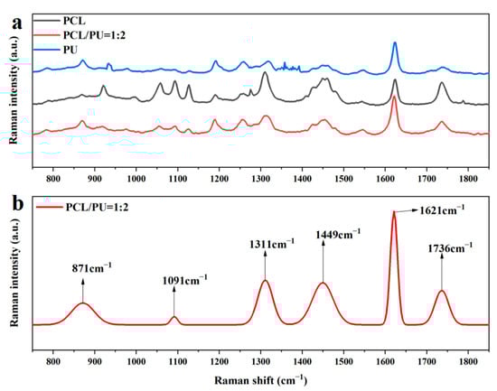 (a) Raman spectra of electrospun PU, PCL, and PCL/PU (1:2). (b) Fitting curve of Raman spectrum of PCL/PU (1:2) sample.