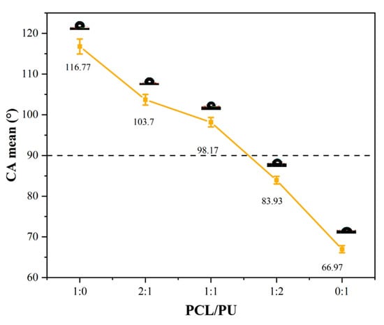 The angle between the solid–liquid interface was called the surface contact angle. The smaller the contact angle, the stronger the hydrophilicity. The larger the contact angle, the stronger the hydrophobicity. Figure 6 shows a line plot of the contact angle of the ordered layer at the initial time point as a function of the composition. It can be seen that for the intermediate ordered layer, as the proportion of PU increases, the contact angle becomes smaller and the hydrophilicity becomes stronger, and the PCL/PU composite layer transforms from a hydrophobic to a hydrophilic material. Considering only the hydrophilicity, the smaller the contact angle of hydrophilic materials, the stronger the interaction between their surface and the outside of the cell membrane, and the stronger the adhesion of cells, which is more conducive to the spreading and growth of cells on the material surface [26]. Although the outer PCL is a hydrophobic material, which has a certain effect on the adsorption of cells, its excellent degradability, high porosity, biocompatibility, mechanical properties, and other advantages make its shortcomings acceptable. These advantages give the heart valve strong potential in the cardiovascular field. In the future, it can also be improved by surface modification and other means to improve its cell affinity and anticoagulant balance [27].