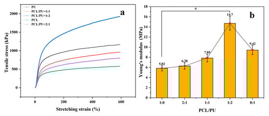 For PCL/PU = 1:2 sample, the axial Young’s modulus of the valve leaflet was the highest, at 14.70 MPa. For native heart valve leaflets, axial forces are much greater than radial forces. The axial elastic modulus of native aortic valve leaflets is about 5–15 MPa depending on the individual, genetics, sex, race, blood, blood pressure, etc. [28]. As shown in Figure 7b, the Young’s moduli of the electrospun heart valves were basically within the normal interval.