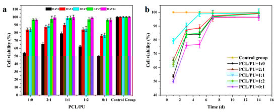Figure 8a shows the changes in cell survival rate and the dynamic proliferation process of each experimental group at different time points under the test conditions. It can be seen that for the PCL/PU = 1:1 sample, the survival rate is the highest and the cytocompatibility of the material is the best. With the passage of time, the effects of different components on cell viability also gradually decreased, and finally were basically the same. Various factors such as materials, hydrophilicity, and structure can affect the experimental results. For the PCL:PU = 1:1 sample, the system is in a dynamic equilibrium state under the influence of multiple factors and has a high survival rate. The cell survival rate was greater than 90% on the 14th day. It can be concluded that the materials in this experiment are non-cytotoxic and have good cytocompatibility.
