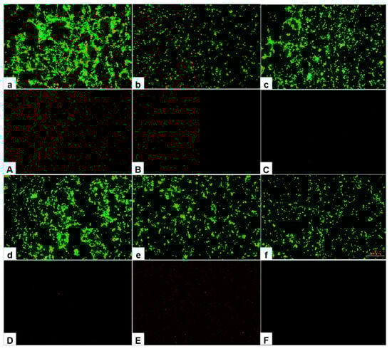 Live and dead staining microscopic photographs of cells cultured to day 3. (a–f) Live cell staining of control group; PCL/PU = 1:0, 2:1, 1:1, 1:2, and 0:1, respectively. (A–F) Dead cell staining of control group; PCL/PU = 1:0, 2:1, 1:1, 1:2, and 0:1, respectively.
