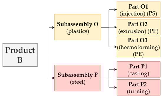Product A is a more complex product with a greater number of subassemblies and parts. It consists of 4 subassemblies, which have a total of 14 parts. The elements are made of steel, aluminum, and plastics. One of the subassemblies consists of electronic elements (e.g., control elements, power supply systems, etc.). A list of all the parts of product A, in the form of a BOM (bill of materials) structure, is shown in Figure 1.